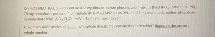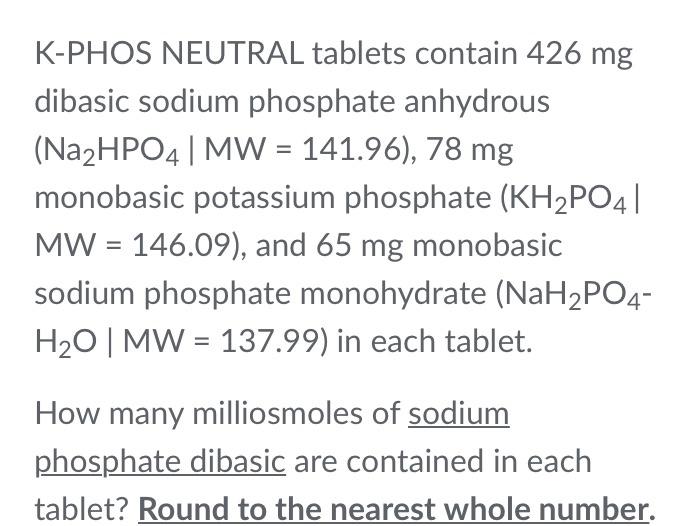 each tablet contains 852 mg dibasic sodium phosphate anhydrous 155 mg monobasic potassium phosphate and 130 mg monobasic sodium phosphate monohydrate each tablet yields approximately 250 mg of phosphorus 298 mg of sodium 13 0 meq